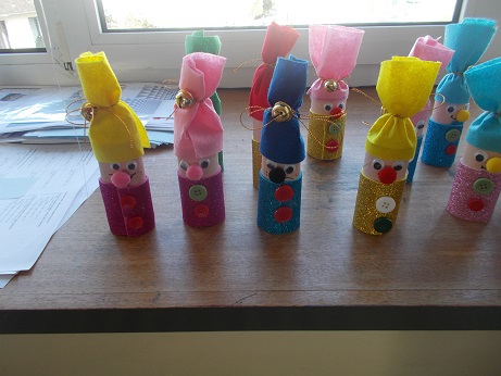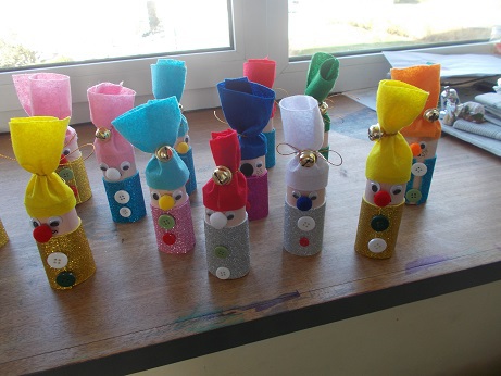 Comme bricolages de Noël nous avons réalisé des lutins de Noël très colorés et très pailletés.