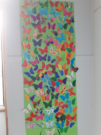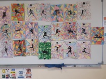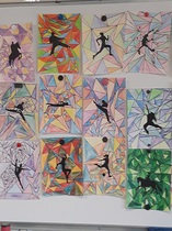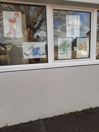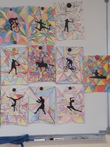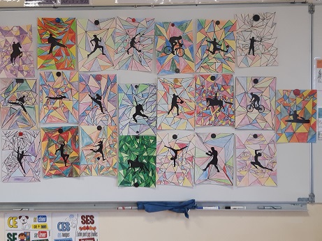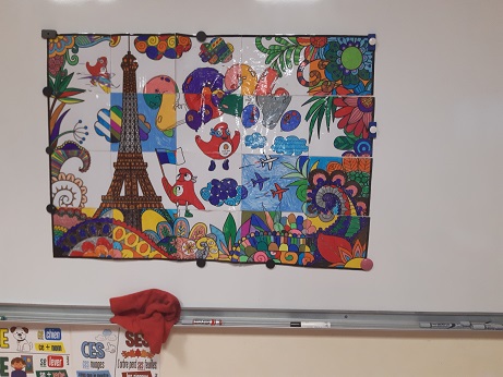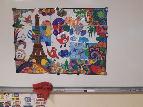 Pendant que les CE et les CP réalisaient leurs séances de piscine, les GS et les CM ont réalisé un coloriage ccollaboratif sur le thème des JO. Ce coloriage est affiché dans le hall.