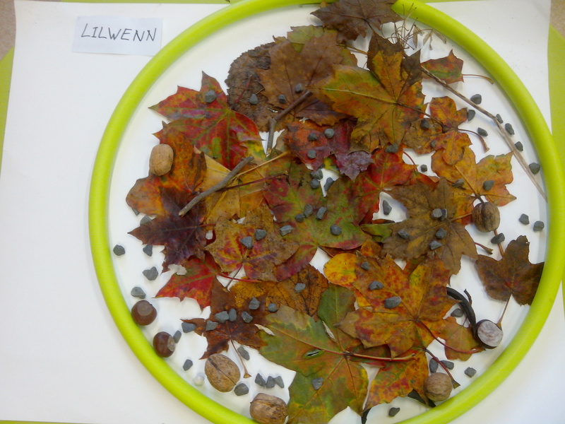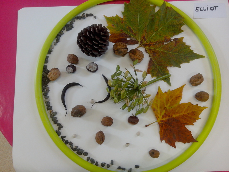 Tout d'abord, nous avons ramassé des feuilles puis les enfants ont rapporté des fruits secs de chez eux et ensuite, ils ont crée leurs compositions.