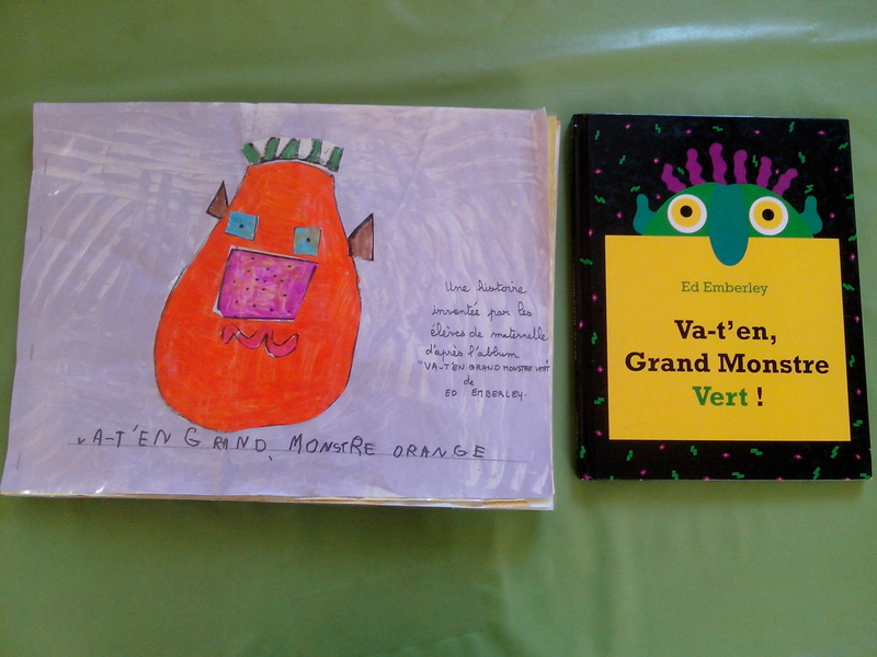 Nous avons réalisé un album à la manière de "Va t'en grand monstre vert". Les élèves de petite section et de moyenne section ont réalisé les fonds des différentes pages avec différentes techniques de peinture. Les élèves de grande section ont créé leur monstre et inventé leur histoire en suivant la structure de l'album de Ed Emberley.