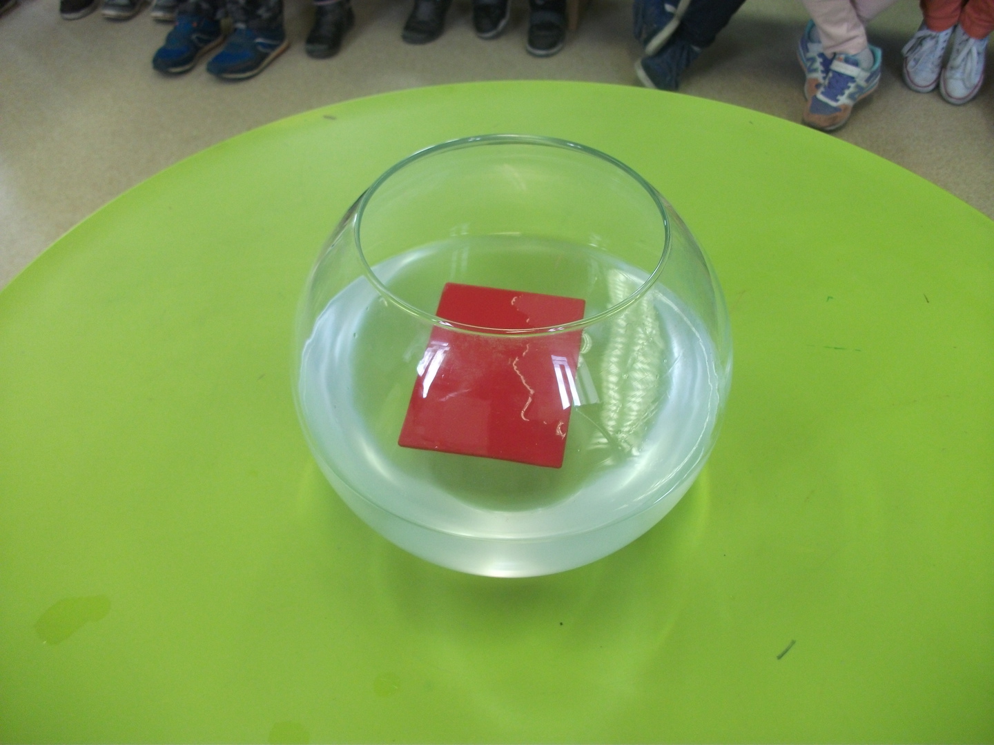 La maîtresse a posé sur la table un aquarium rempli d'eau et les enfants vont chercher différents objets (pâte à modeler, bout de bois, rectangle en plastique, gomme...) pour regarder s'ils flottent ou s'ils coulent.