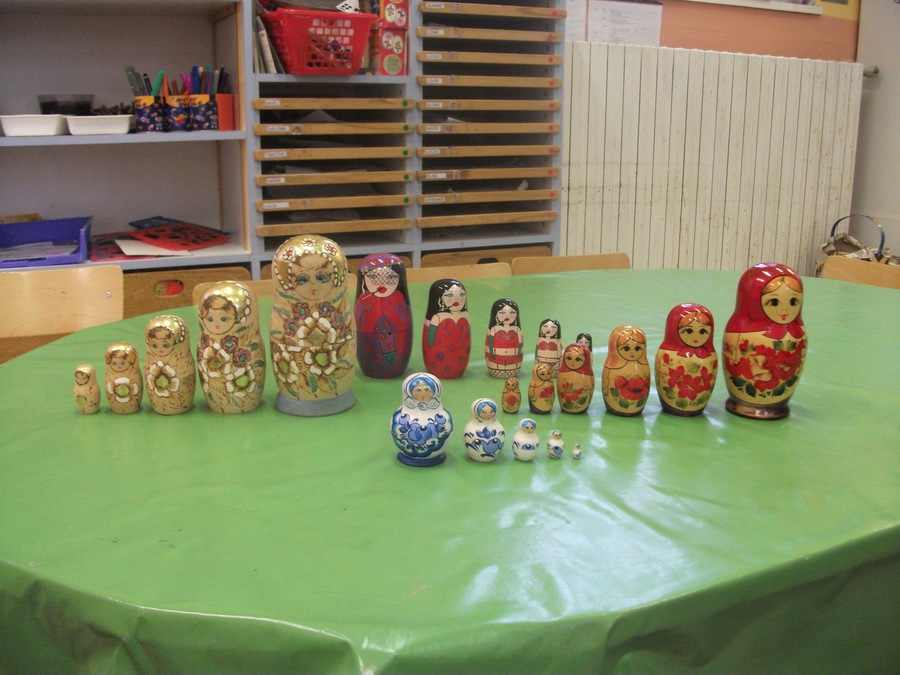 Pendant cette période, nous avons étudié l'album "La moufle", un conte russe. Cela a été l'occasion pour nous de découvrir les célèbres poupées russes, les matriochkas qui s'emboîtent les unes dans les autres: