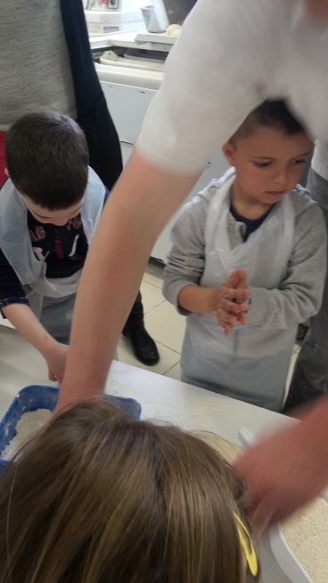 En lien avec le travail réalisé à partir du conte"La petite poule rousse", les élèves sont allés faire du pain à la boulangerie Le Mat de La Roche-Derrien